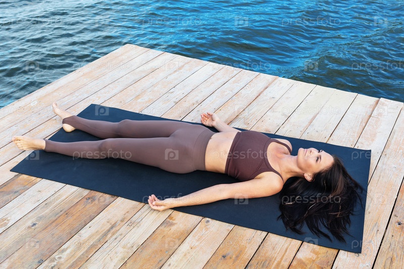 Женщина, практикующая йогу, выполняет расслабляющие упражнения шавасана после основной тренировки, тренируется в спортивной одежде, лежа на деревянном мосту на берегу озера