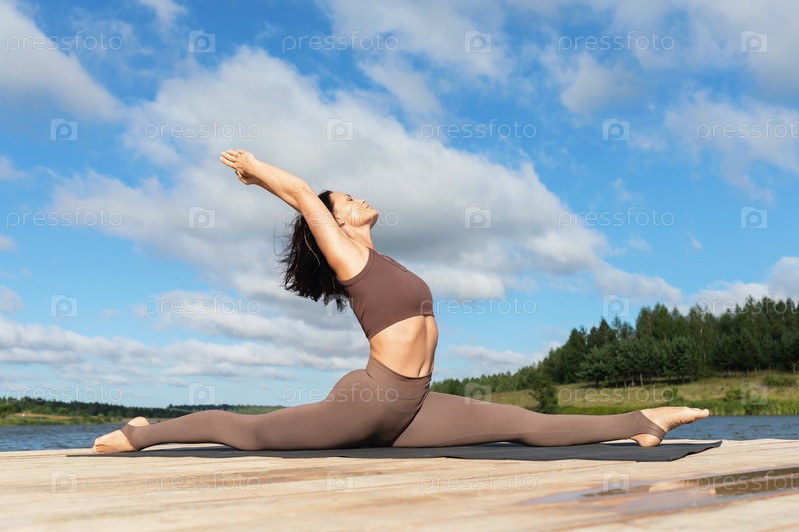 Женщина, практикующая йогу, выполняет упражнение Хануманасана, продольный шпагат, в полный рост, тренируется в спортивной одежде на берегу озера теплым солнечным утром