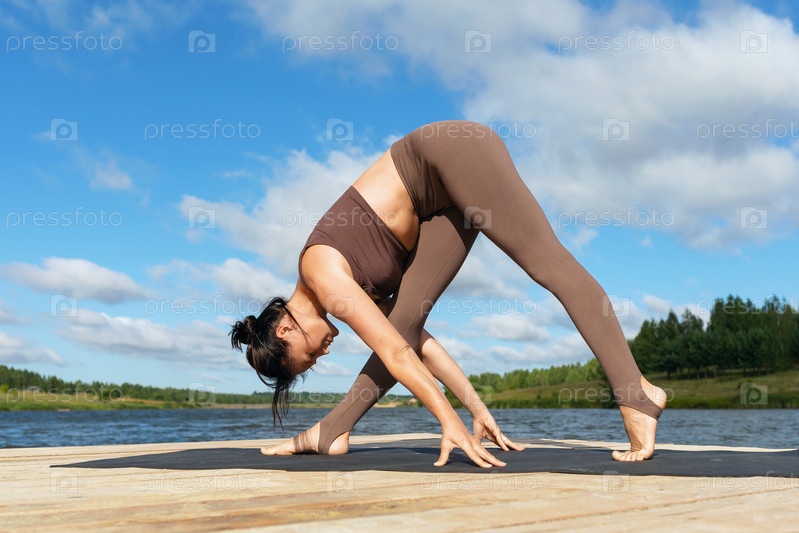 Женщина-практикующая йогу выполняет вариацию Паршвоттанасаны, позы интенсивного бокового растяжения, тренируясь в спортивной одежде на берегу озера теплым солнечным утром
