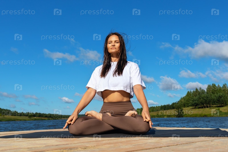 Женщина, ведущая здоровый образ жизни и занимающаяся йогой, медитирует, сидя в позе лотоса на берегу озера, тренируется в спортивной одежде, в леггинсах и белой футболке