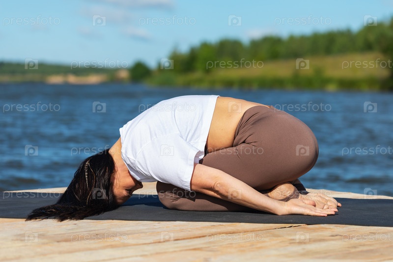 Женщина, практикующая йогу, выполняет упражнения Баласана, детскую позу, тренируется в спортивной одежде на берегу озера теплым солнечным утром