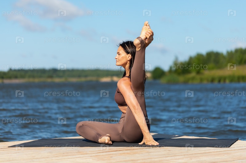 Женщина, ведущая здоровый образ жизни и практикующая йогу, выполняет упражнение янтрасана, позу компаса, тренируется в спортивной одежде, сидя на деревянном мосту на озере