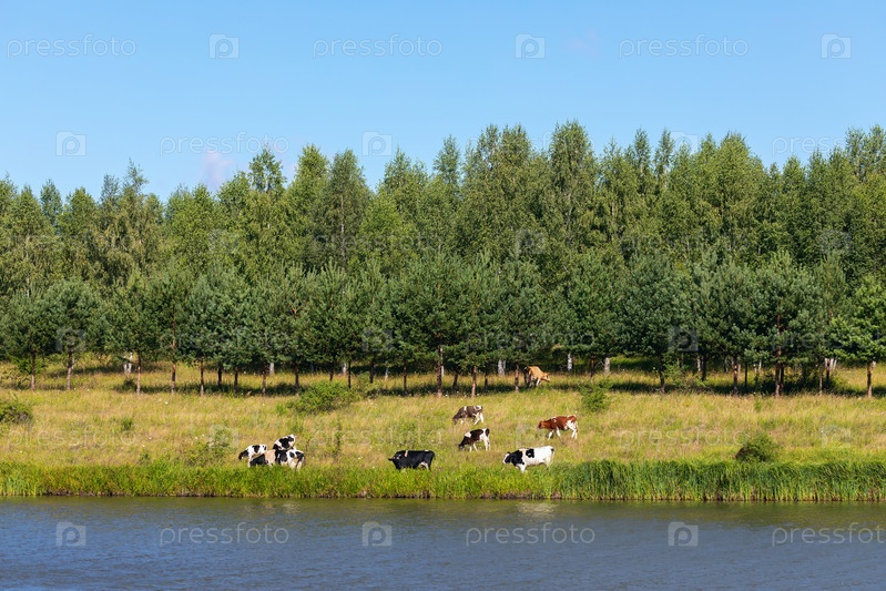 Сельский пейзаж, пасущиеся коровы на лугу у озера в солнечный день