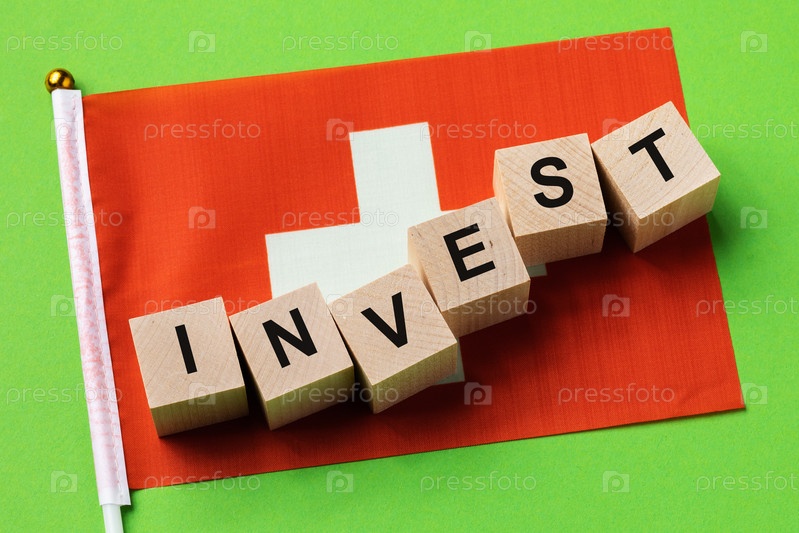 Деревянные кубики с текстом и флагом на цветном фоне, концепция на тему инвестиций в Швейцарии