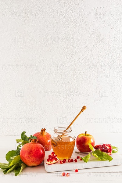 Красивый натюрморт со спелыми гранатами и яблоками, чашей меда. Белый фон. Концепция Рош ха-Шана. Пространство для копирования. Вертикальный вид