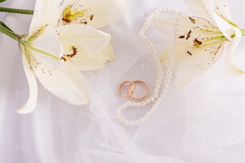 Красивый свадебный фон с парой обручальных золотых колец, жемчужными бусинами и белыми живыми лилиями. ткань атласная на белом фоне