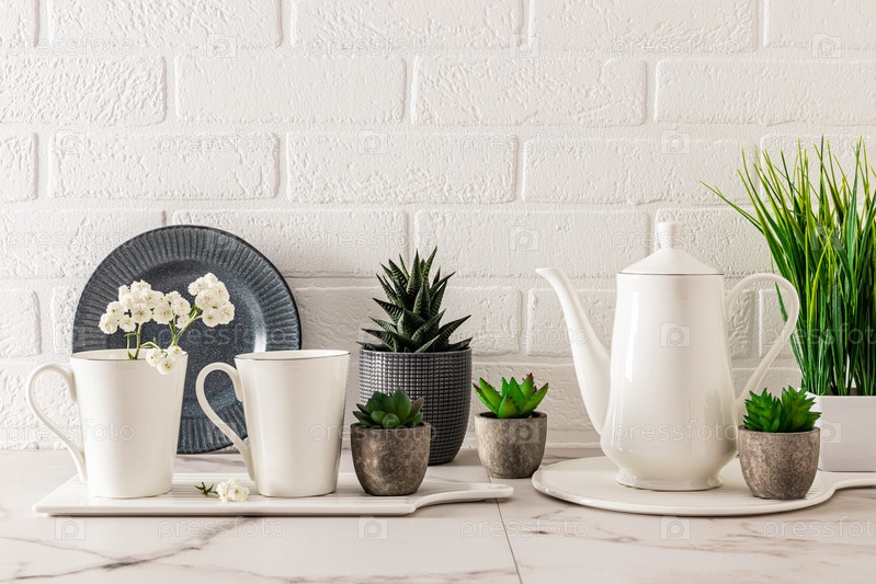 Кофейник из белого фарфора и высокие кружки на белой подставке на мраморной столешнице напротив стены из белого кирпича. Стильная кухня