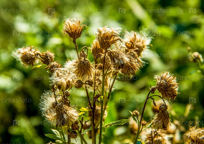 Сухой чертополох, чертополох на фоне зеленой травы, в летний день. Сухие растения