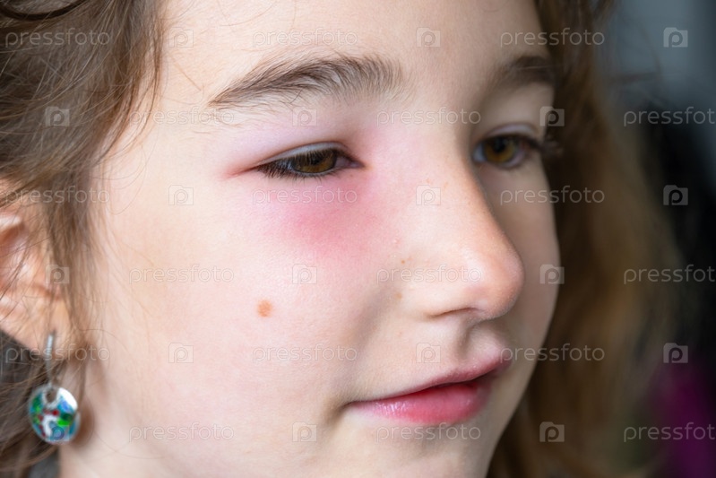 Красное опухшее веко на детском лице крупным планом – аллергия на укус насекомого. Аллергическая реакция на кровососущих насекомых