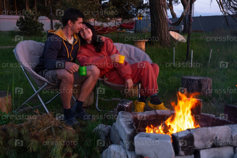 Влюбленная пара сидит у костра во дворе дома на кемпинговых стульях, романтический вечер. мужчина и женщина греют руки у костра, пьют чай