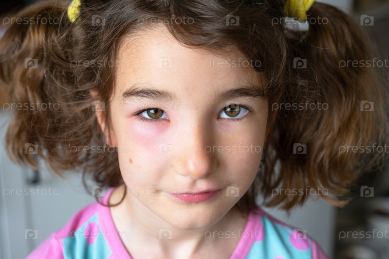 Красное опухшее веко на детском лице крупным планом – аллергия на укус насекомого. Аллергическая реакция на кровососущих насекомых