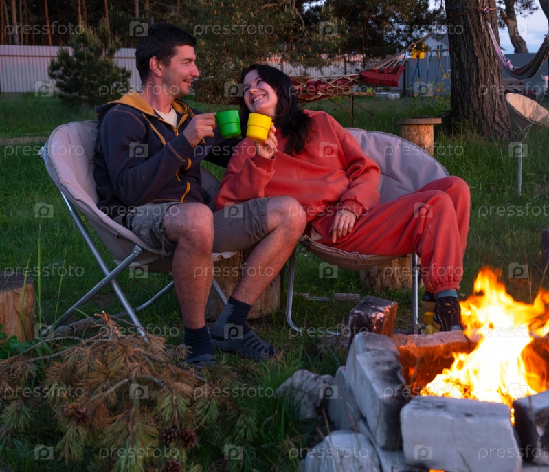 Влюбленная пара сидит у костра во дворе дома на кемпинговых стульях, романтический вечер. мужчина и женщина греют руки у костра, пьют чай