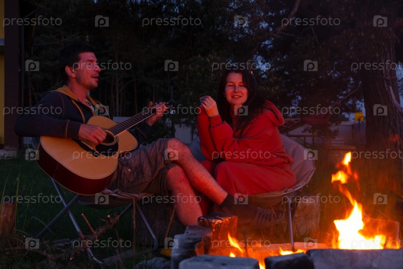 Мужчина играет на гитаре, женщина слушает и подпевает. Влюбленная пара сидит у костра во дворе дома на стульях для кемпинга, романтический вечер
