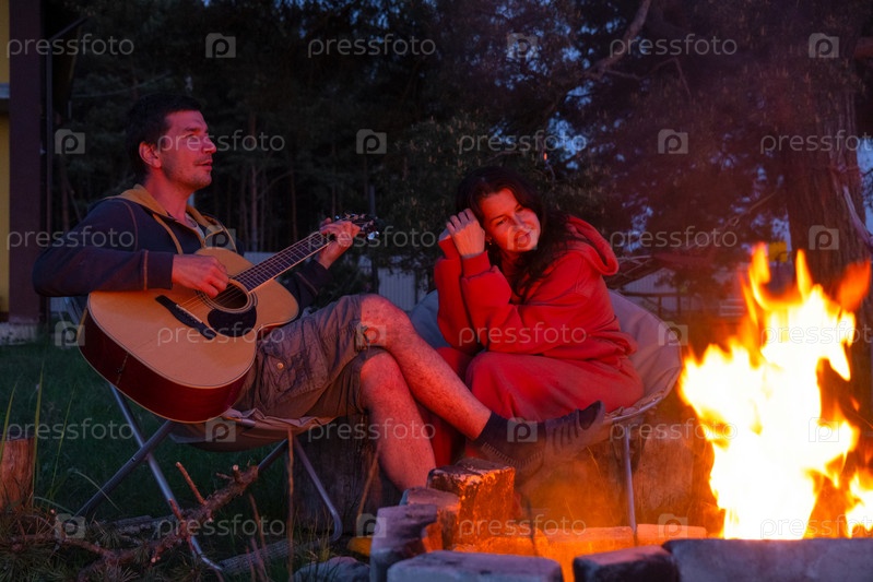 Мужчина играет на гитаре, женщина слушает и подпевает. Влюбленная пара сидит у костра во дворе дома на стульях для кемпинга, романтический вечер
