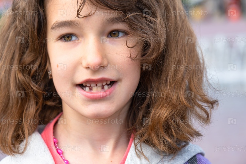 Беззубая счастливая улыбка девушки с выпавшим нижним молочным зубом крупным планом. Смена зубов на моляры в детстве