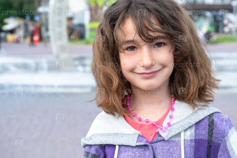 Портрет счастливой девочки с задорной и озорной улыбкой крупным планом с короткими вьющимися волосами