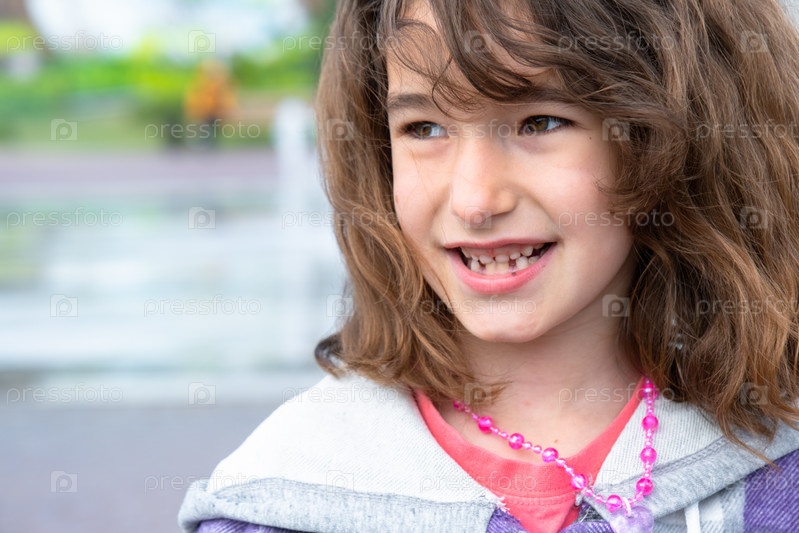Беззубая счастливая улыбка девушки с выпавшим нижним молочным зубом крупным планом. Смена зубов на моляры в детстве