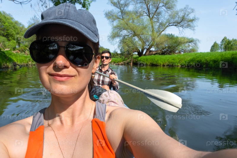 Пара мужчина и женщина, селфи счастливы в семейной прогулке на байдарках, гребной лодке по реке, водным походам, летним приключениям. Экологичный и экстремальный туризм, активный и здоровый образ жизни