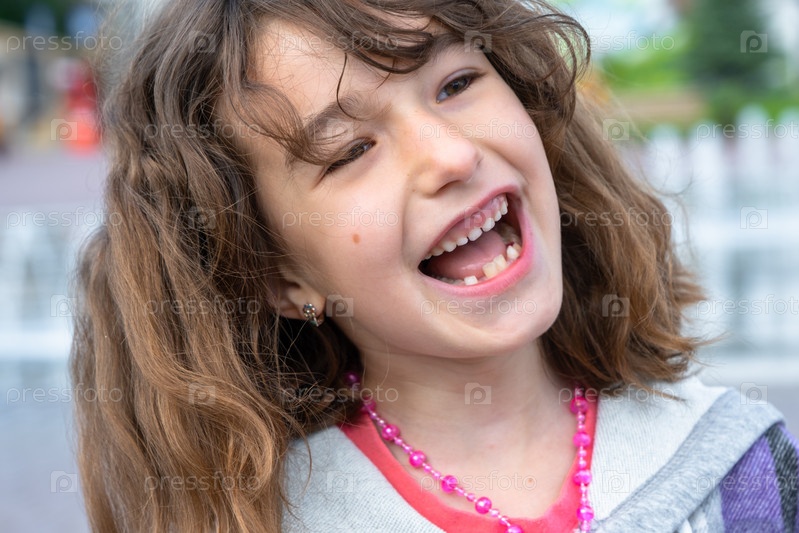 Беззубая счастливая улыбка девушки с выпавшим нижним молочным зубом крупным планом. Смена зубов на моляры в детстве