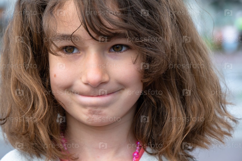 Портрет счастливой девочки с задорной и озорной улыбкой крупным планом с короткими вьющимися волосами