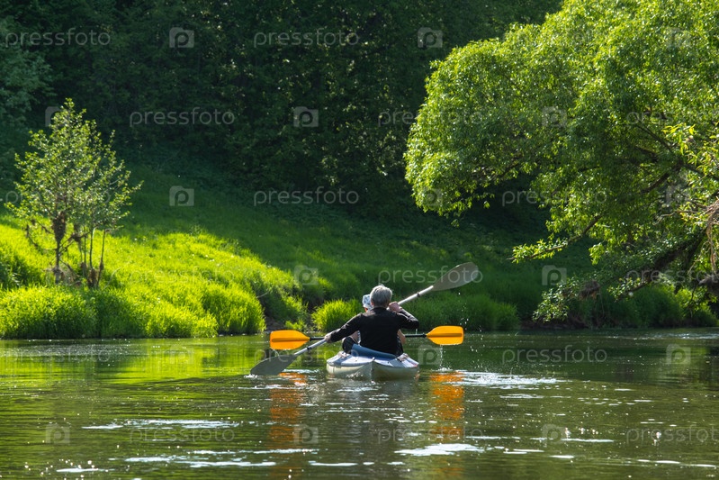 Семейная прогулка на байдарках для сеньора и сеньоры. Пожилая супружеская пара гребет на лодке по реке, водная прогулка, летнее приключение. Возрастной спорт, психическая молодость и здоровье, туризм, активная старость