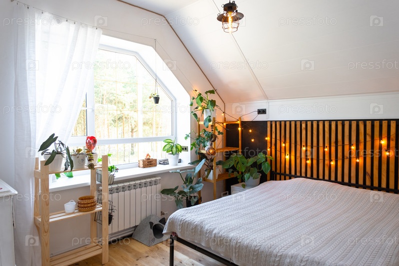 Интерьер спальни в стиле лофт, черная стена с деревянными рейками, металлическая кровать, гирлянда из лампочек в стиле ретро, растения в горшках на трапециевидном окне на чердаке. Современный зеленый дом