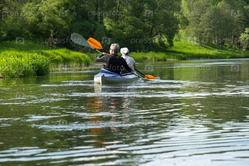 Семейная прогулка на байдарках для сеньора и сеньоры. Пожилая супружеская пара гребет на лодке по реке, водная прогулка, летнее приключение. Возрастной спорт, психическая молодость и здоровье, туризм, активная старость