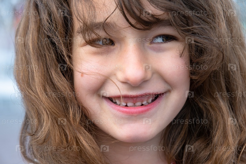 Портрет счастливой девочки с задорной и озорной улыбкой крупным планом с короткими вьющимися волосами