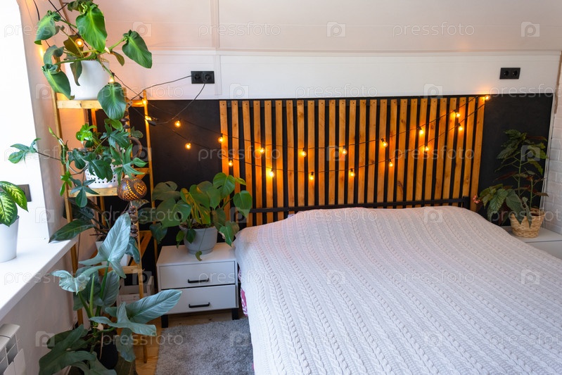Интерьер спальни в стиле лофт, черная стена с деревянными рейками, металлическая кровать, гирлянда из лампочек в стиле ретро, растения в горшках на трапециевидном окне на чердаке. Современный зеленый дом