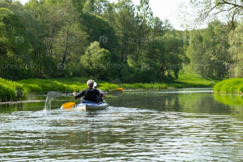 Семейная прогулка на байдарках для сеньора и сеньоры. Пожилая супружеская пара гребет на лодке по реке, водная прогулка, летнее приключение. Возрастной спорт, психическая молодость и здоровье, туризм, активная старость
