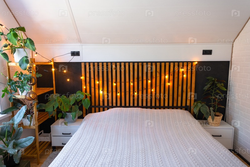 Интерьер спальни в стиле лофт, черная стена с деревянными рейками, металлическая кровать, гирлянда из лампочек в стиле ретро, растения в горшках на трапециевидном окне на чердаке. Современный зеленый дом