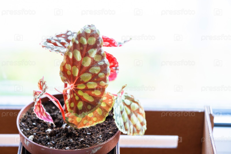 Бегония хлоростичная красная форма крупным планом. Пятнистый лист комнатного растения в горшке на подоконнике