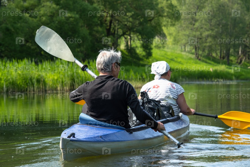 Семейная прогулка на байдарках для сеньора и сеньоры. Пожилая супружеская пара гребет на лодке по реке, водная прогулка, летнее приключение. Возрастной спорт, психическая молодость и здоровье, туризм, активная старость