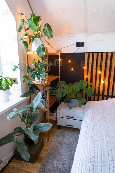 Интерьер спальни в стиле лофт, черная стена с деревянными рейками, металлическая кровать, гирлянда из лампочек в стиле ретро, растения в горшках на трапециевидном окне на чердаке. Современный зеленый дом