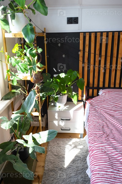 Интерьер спальни в стиле лофт, черная стена с деревянными рейками, металлическая кровать, гирлянда из лампочек в стиле ретро, растения в горшках на трапециевидном окне на чердаке. Современный зеленый дом
