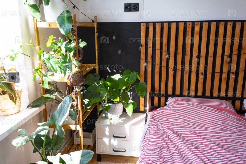 Интерьер спальни в стиле лофт, черная стена с деревянными рейками, металлическая кровать, гирлянда из лампочек в стиле ретро, растения в горшках на трапециевидном окне на чердаке. Современный зеленый дом