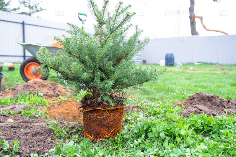 Хвойные растения корейская пихта в горшках с закрытым корнем для посадки на своем приусадебном участке из питомника. Озеленение садового участка весной