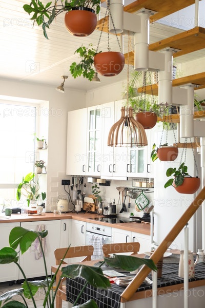 Интерьер белой кухни с металлической лестницей в коттедже с растениями в горшках в подвесных кашпо. Зеленый дом в современном стиле