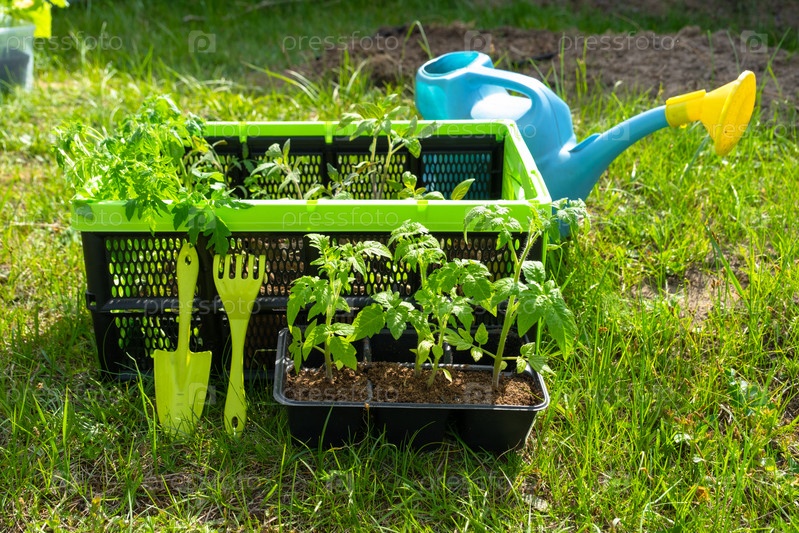 Рассада томатов в торфяных стаканах в ящике для посадки на грядку весной