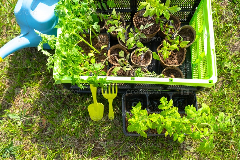 Рассада томатов в торфяных стаканах в ящике для посадки на грядку весной