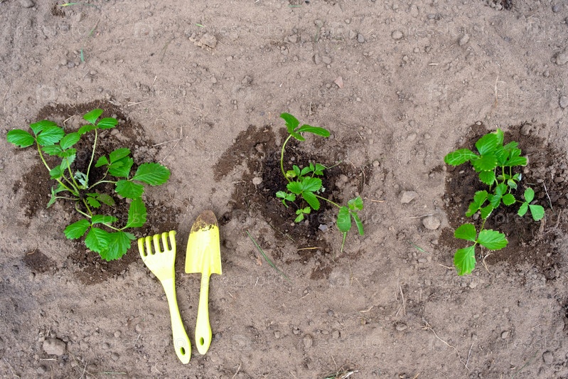 Рассаду клубники высаживают в огород весной, садовый инвентарь – совок и грабли. Экологически чистая ягода, выращенная фермером летом в деревне, урожай