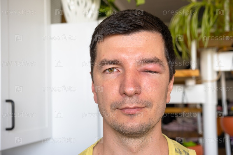 Красное опухшее веко на лице мужчины крупным планом — аллергия на укус насекомого. Аллергическая реакция на кровососущих насекомых
