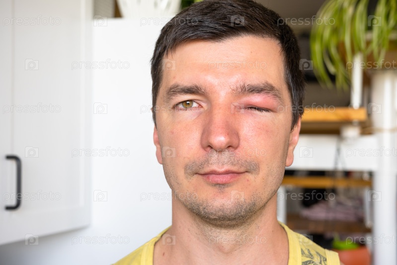 Красное опухшее веко на лице мужчины крупным планом — аллергия на укус насекомого. Аллергическая реакция на кровососущих насекомых