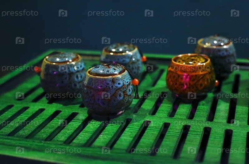 Подготовка к чайной церемонии. Стоящие на зеленом деревянном подносе фарфоровые чайницы
