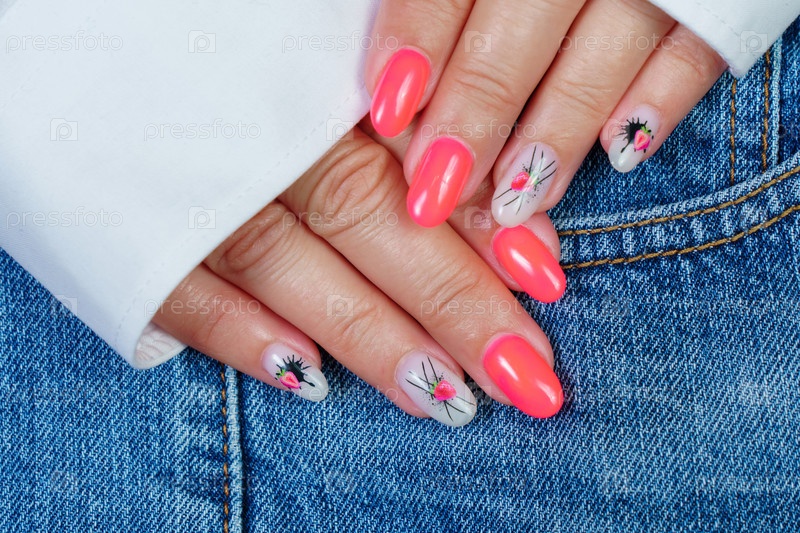 Женские руки с розовым маникюром и голубым лаком для ногтей на фоне джинсов