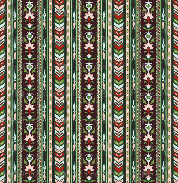 Геометрический дамасский орнамент. Икат границы. Этническая вышивка с листьями и монограммами. Племенная векторная текстура. Бесшовный народный узор в ацтекском стиле. Индийский, скандинавский, цыганский, мексиканский, африканский ковер
