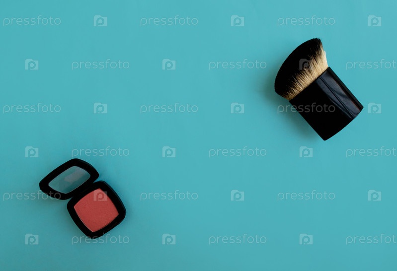 Кисть и румяна на синем фоне. Фон с копией пространства