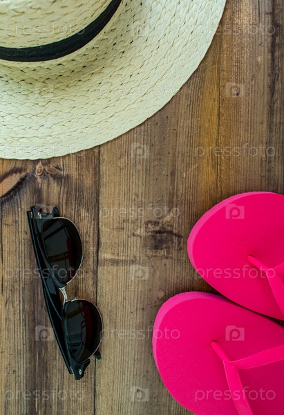 Летние каникулы, квартира. Шляпа, шлепанцы и купальник на темном деревянном фоне, вертикальный фон