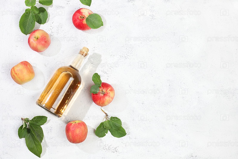 Яблочный напиток, сок или ферментированный фруктовый напиток и ингредиенты на солнечном столе. Осеннее знамя. Концепция диеты и потери веса. Здоровое питание, детоксикация организма, яблоки способствуют очищению организма и снижению веса. выборочный фокус