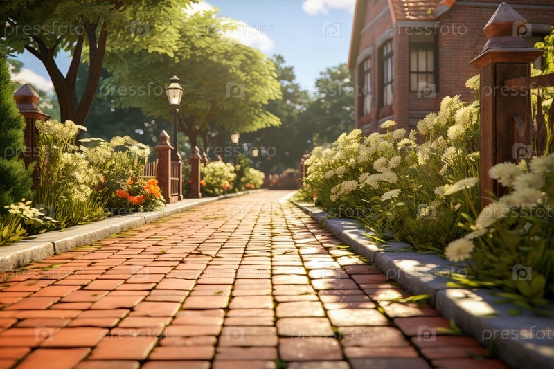 Дорожка к дому из клинкерного кирпича, благоустройство. Генеративный ИИ. Иллюстрация высокого качества